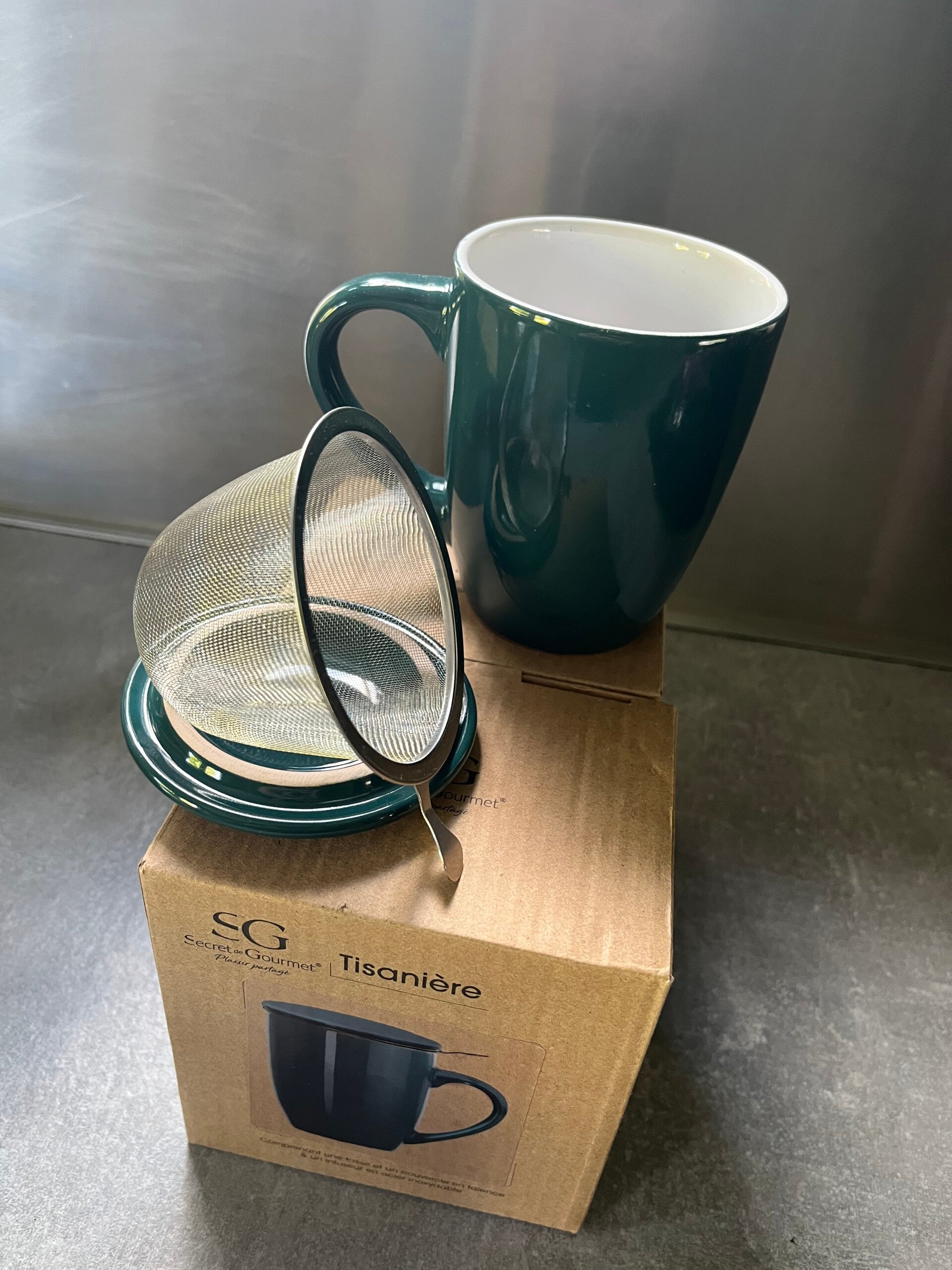 La boîte contient une tasse, un filtre et un couvercle (très utile pour éviter que le breuvage refroidisse pendant l'infusion).